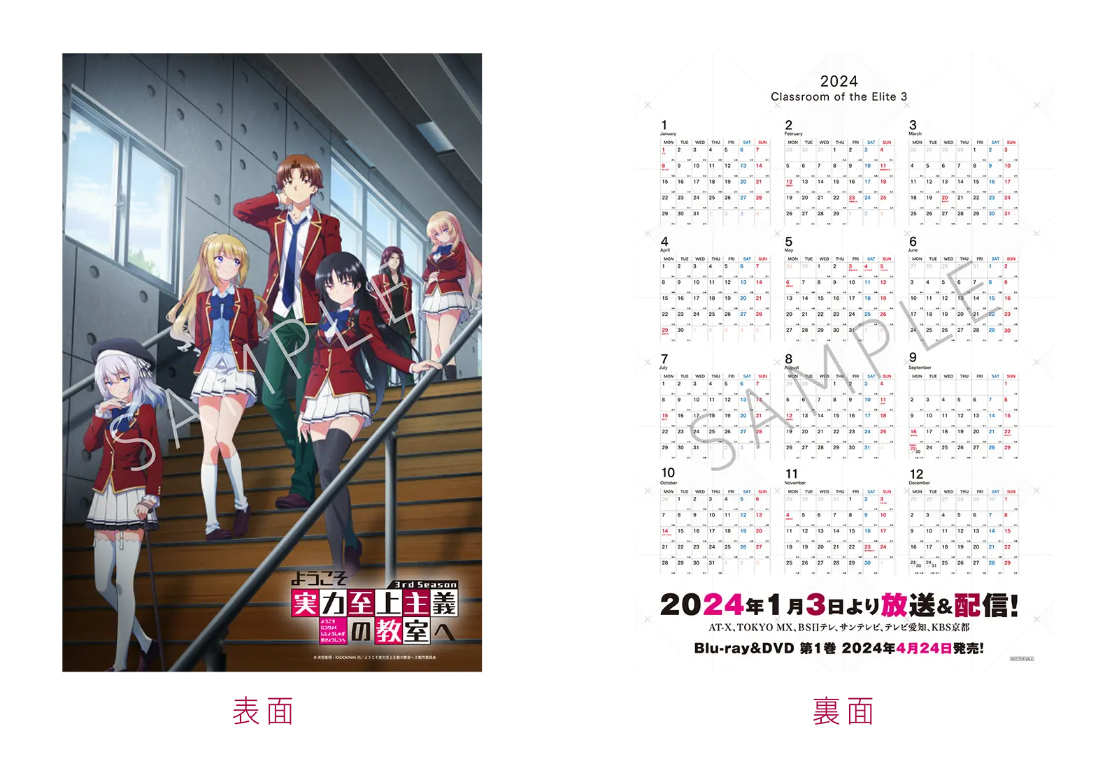 12月30日、31日に開催されるコミックマーケット103にて 「ようこそ実力至上主義の教室へ 3rd Season」ポストカードの配布が決定しました。 裏面は2024年度のカレンダーになっています。 是非KADOKAWAブースへお立ち寄りください。