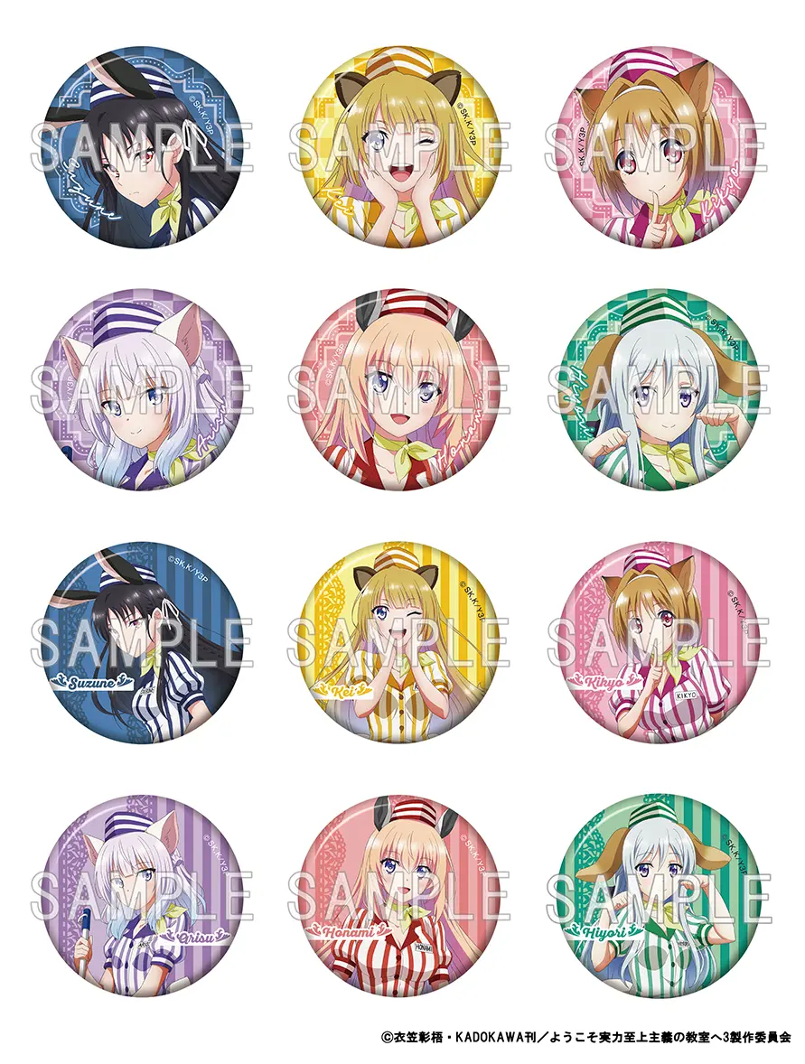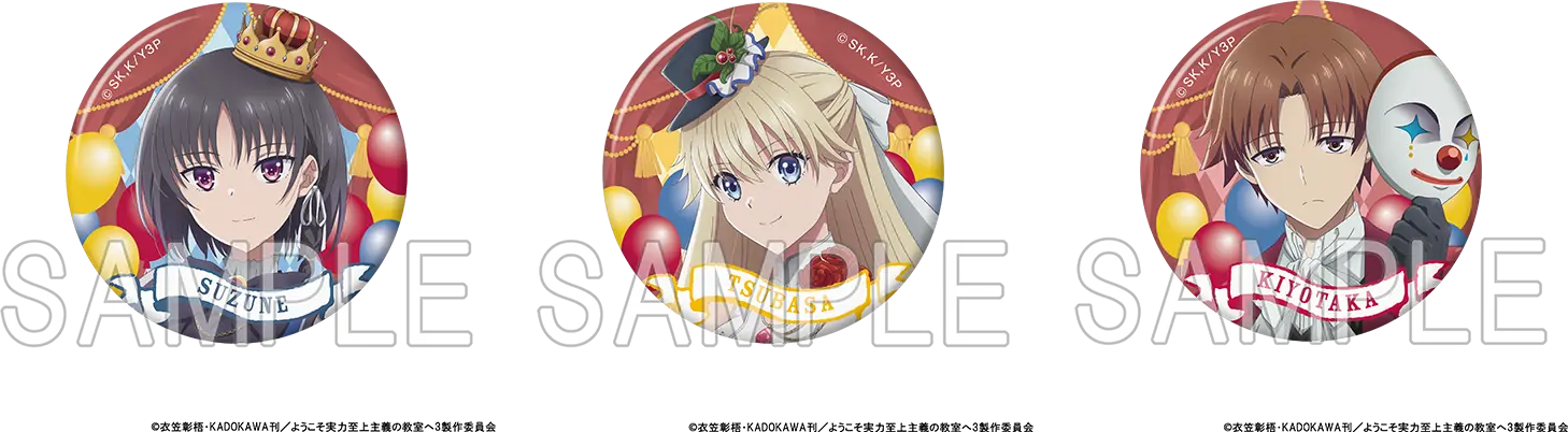 TVアニメ「ようこそ実力至上主義の教室へ」より、カーニバルをテーマにした新規描き下ろしイラストを使用した缶バッジセットが登場です! 【仕様】 種類数:全1種オープン/缶バッジ3個入り サイズ:約直径56mm 材質:紙、鉄、PET