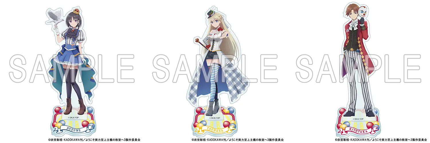 TVアニメ「ようこそ実力至上主義の教室へ」より、カーニバルをテーマにした新規描き下ろしイラストを使用したアクリルスタンドフィギュアが登場です! 【仕様】 種類数:全3種オープン サイズ: 【本体】H150mm×W68mm以内 ※絵柄によってサイズは異なります。 【台座】H53mm×W60mm以内(共通) 材質:アクリル樹脂