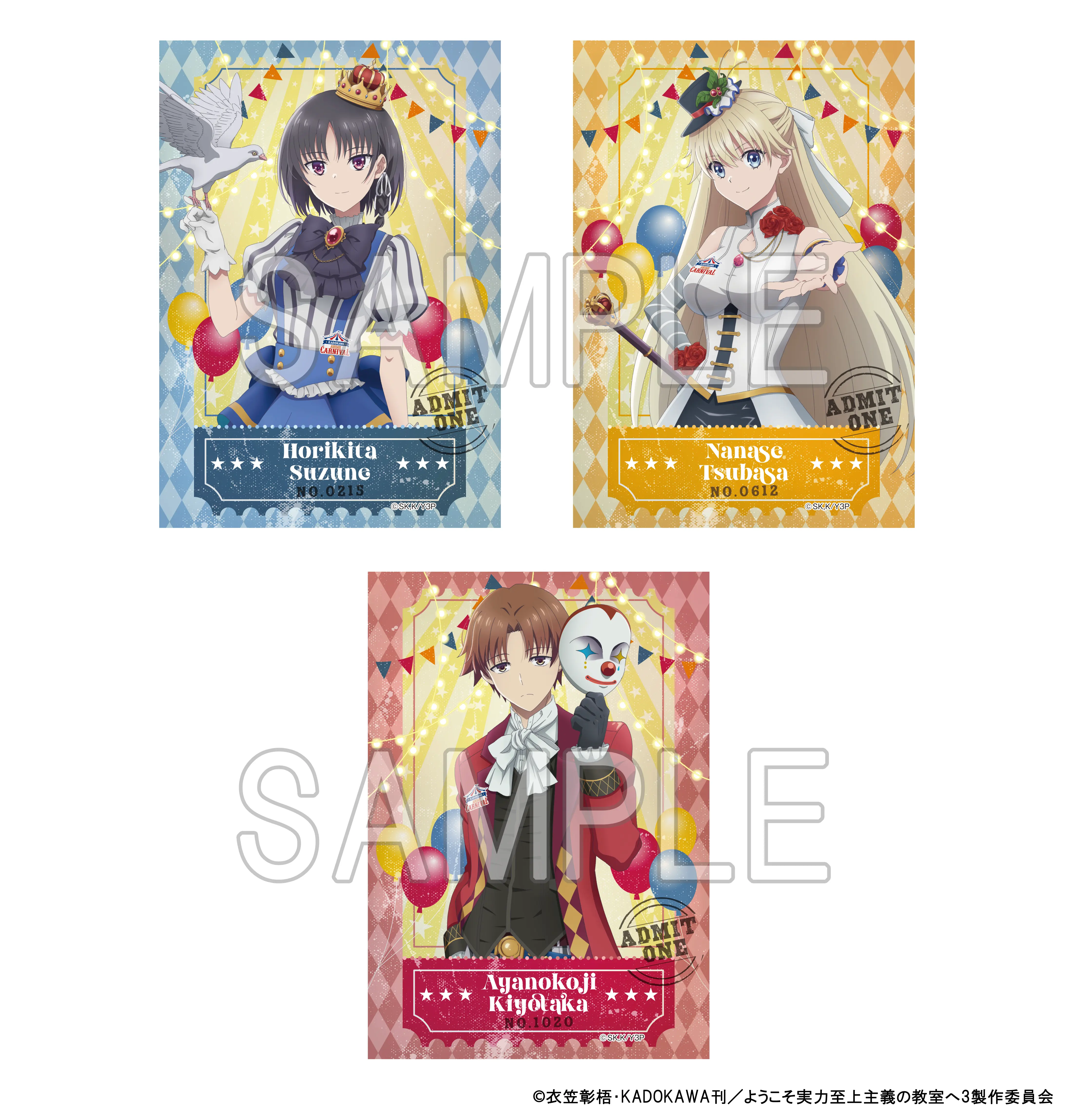 TVアニメ「ようこそ実力至上主義の教室へ」より、カーニバルをテーマにした新規描き下ろしイラストを使用したブロマイドセットが登場です! 【仕様】 種類数:全1種オープン/ブロマイド3枚入り サイズ:L判(約H127 mm×W89mm) 材質:紙
