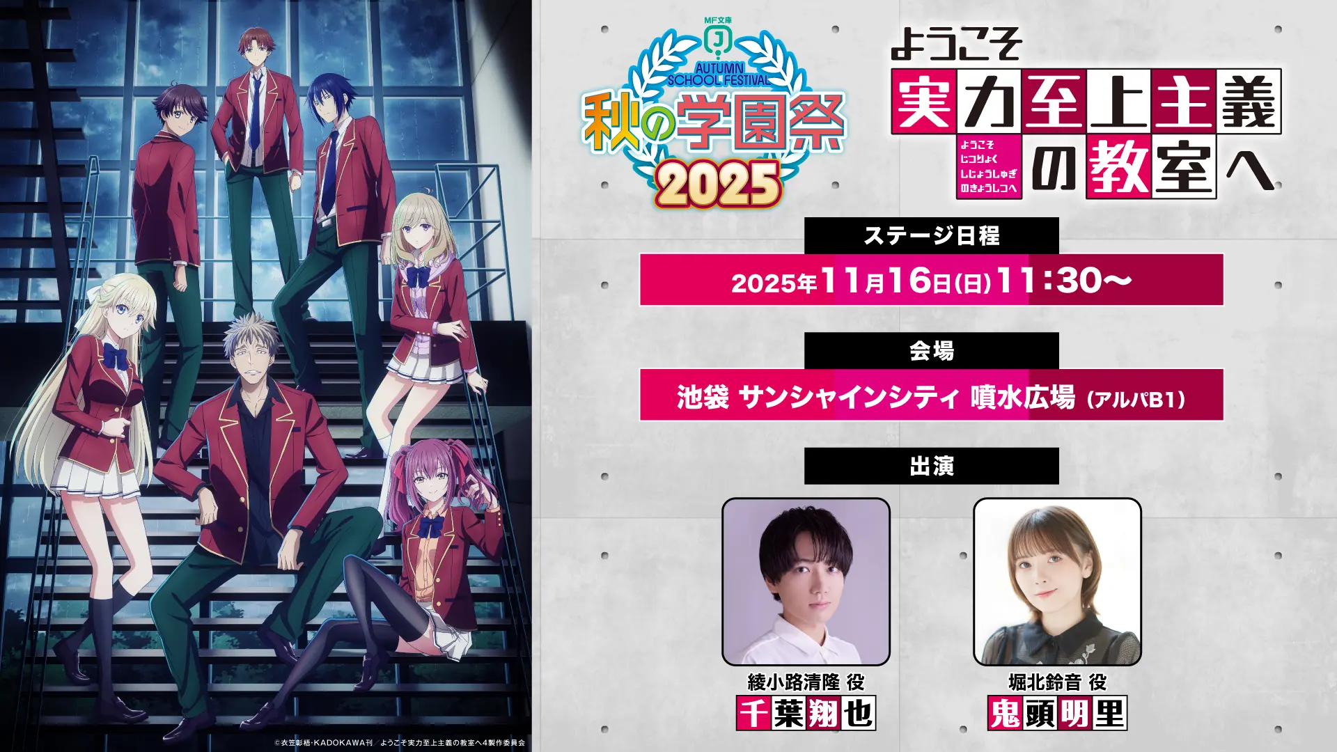 11月16日に開催される「MF文庫J秋の学園祭2025」イベントにて、「ようこそ実力至上主義の教室へ」のステージ出演が決定! ステージ観覧方法は、イベントサイトをご確認ください。