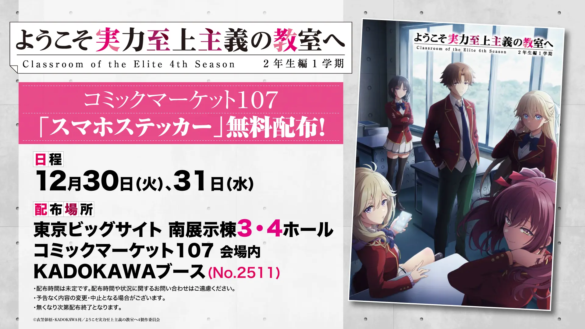 12月30日、31日に開催される「コミックマーケット107」にて、「ようこそ実力至上主義の教室へ 4th Season」スマホステッカーの無料配布が決定! 2年生編キービジュアルを使用した特製デザインです。 ぜひ受け取りにきてください!